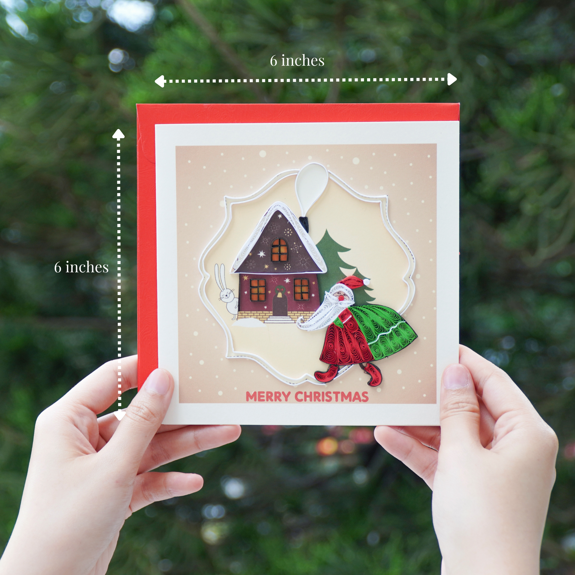 ๐จ Unique Handmade Art โ Featuring Santa with his gift bag beside a cozy winter home and Christmas tree, crafted with detailed quilling technique.