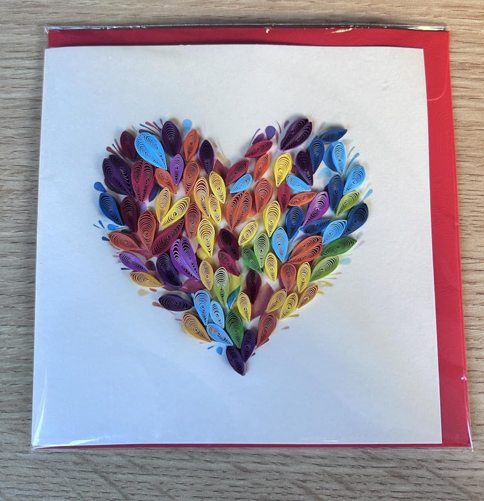 Flowers fade, but art lasts forever. Our Handmade Quilling Rainbow Heart Card celebrates love in all its vibrant forms through the intricate art of paper quilling. This design features a perfectly formed heart, radiating a full spectrum of colors—from fiery red to deep violet—each coil meticulously hand-rolled to create a mesmerizing 3D high-relief texture.